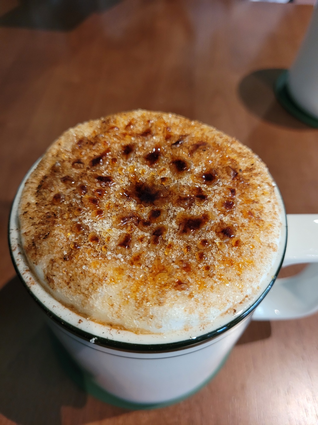 츄러스치노는 크림브륄레 맛이 나요. 계피향과 불에 그을린 설탕맛이 커피와 어우러져서