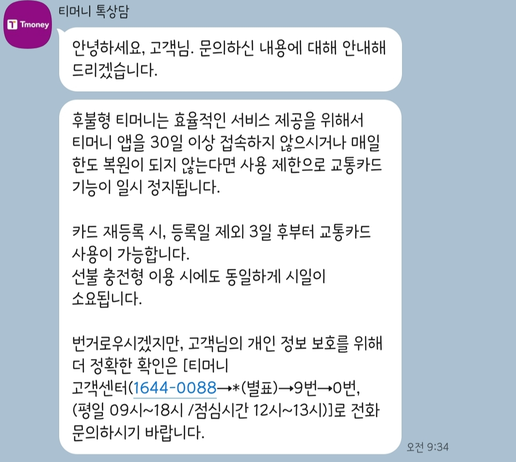 삼성페이 교통카드를 30일 이상 미사용할 경우 삼성페이 교통카드는 중지가 된다고 합니다. 저는 30일 이상 삼성페이 교통카드를 사용하지 않아 해당 내용을 티머니사에 문의했는데요. 다음과 같은 답변을 받을 수 있었습니다.