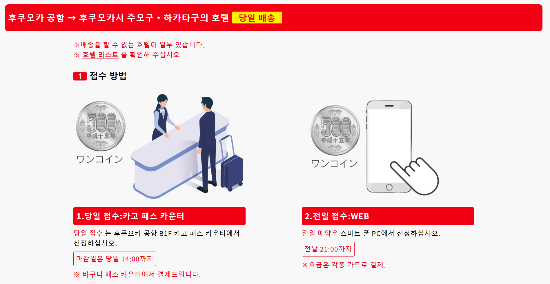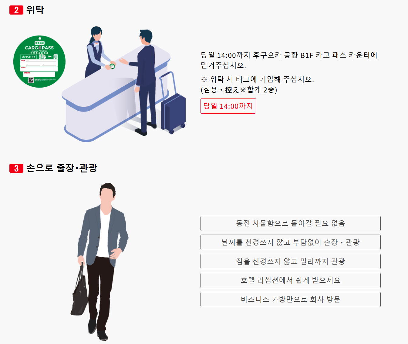 후쿠오카 여행은 공항과 도심이 가깝다는 장점이 있는데요. 가까운 거리이지만 캐리어를 계속 가지고 다니면서 여행을 하려면 체력소모가 심하고 호텔에 짐을 맡겨놓고 다시 여행을 이어가려면 시간소모도 많이 된다는 점이 참 불편합니다. 이런 불편을 줄이기 위한 방법으로 공항에서 짐을 맡기면 호텔까지 배송해 주는 서비스를 소개해드립니다.