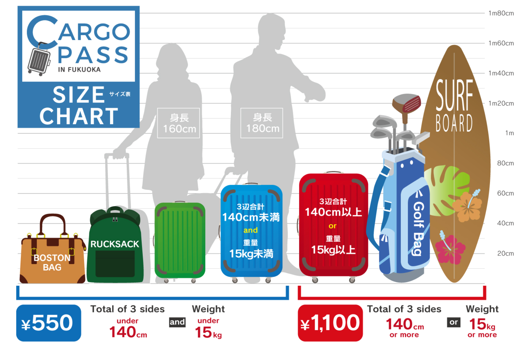 카고패스 이용요금은 짐의 가로+세로+높이=140cm이면서 15kg가 넘지 않으면 550엔, 그 이상일 경우 1100엔이라고 합니다. 후쿠오카로 입국한 다음 바로 맡기는 경우 보통 수화물 무게가 15kg가 넘는 경우가 많지 않기 때문에 큰 캐리어를 이용하지 않는 이상 550엔으로 이용할 수 있을 것 같아 저는 여행 시 카고패스를 이용하고자 합니다.