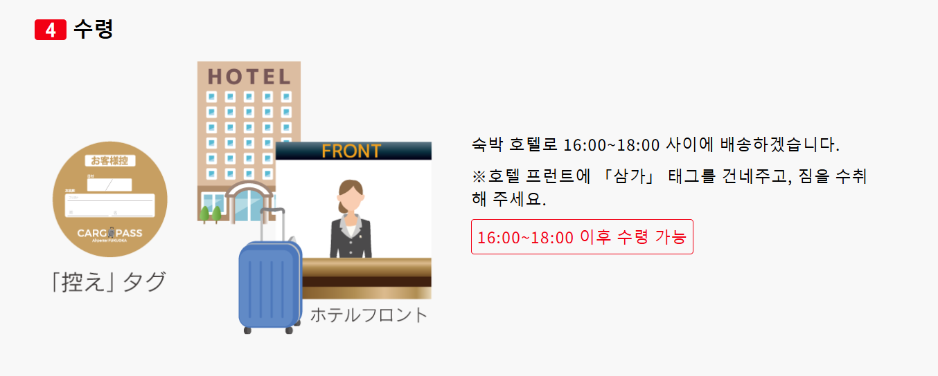 카고패스는 후쿠오카 공항에서 8:30부터 14: 00 사이에 수하물을 맡기면 당일 18:00 이후에는 호텔에서 수령 가능하다고 합니다. 공항에서 짐을 맡긴 후 여행을 하다가 내가 묵는 숙소에서 짐을 찾을 수 있어 너무 편할 것 같아 저는 곧 다가오는 후쿠오카 여행 시 카고패스 서비스를 이용하고자 합니다.